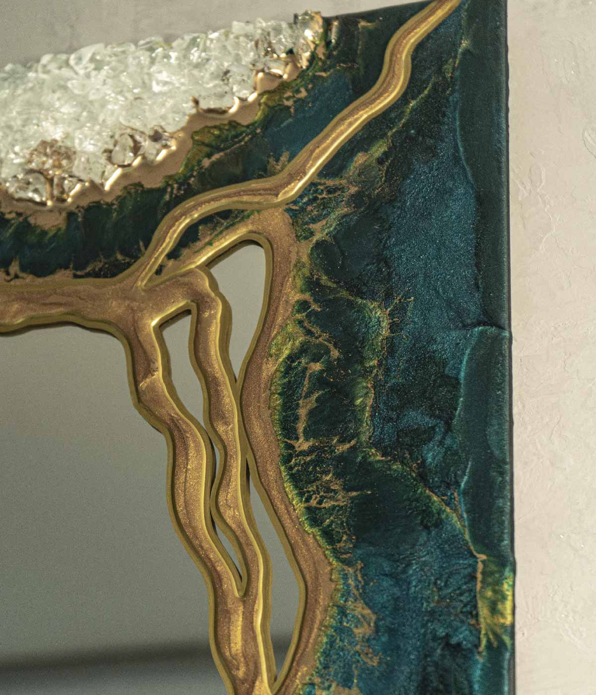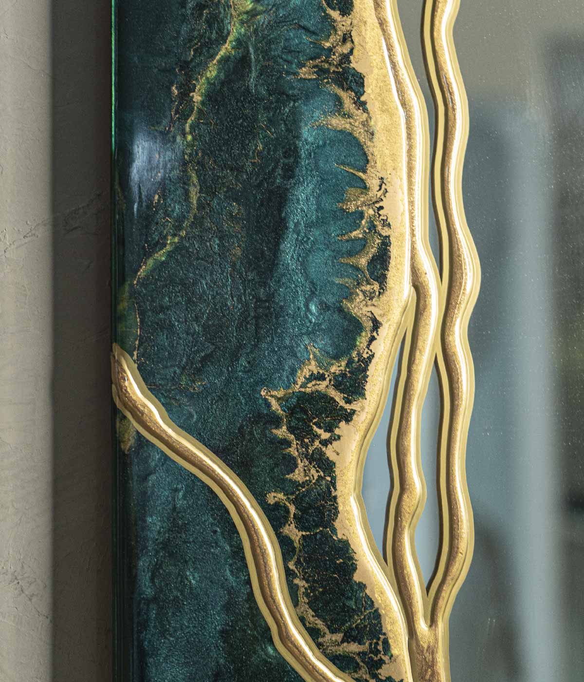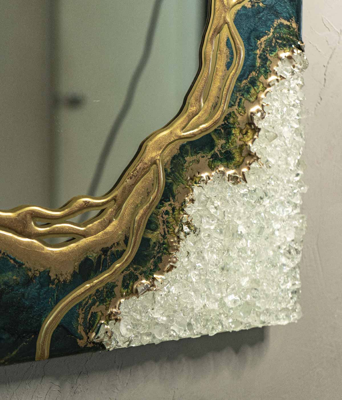 Hermoso espejo Geometrico de pared perfecto para complementar tus espacios en colores esmeralda, dorado, lineas en relieve y hermosos cuarzos