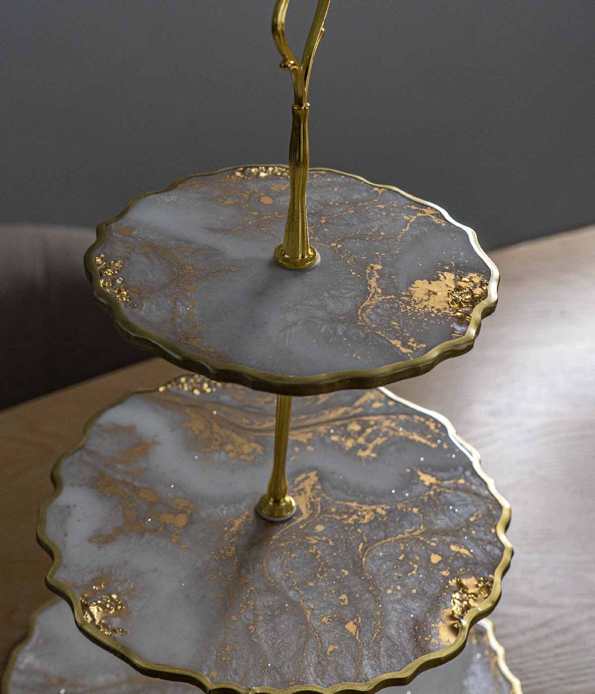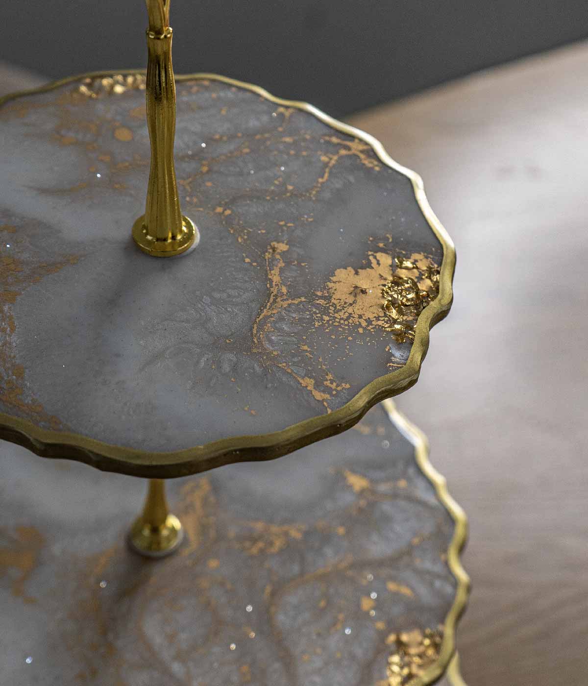 Esta elegante torre multinivel es perfecta para exhibir postres, aperitivos o cualquier otro tipo de presentación culinaria. Con un diseño sofisticado en tonos nacarados y detalles dorados, cada nivel está delicadamente elaborado para aportar un toque de lujo y distinción a cualquier ocasión. Su estructura escalonada facilita la organización y el acceso, haciendo que esta pieza no solo sea funcional, sino también una verdadera obra de arte para la mesa.