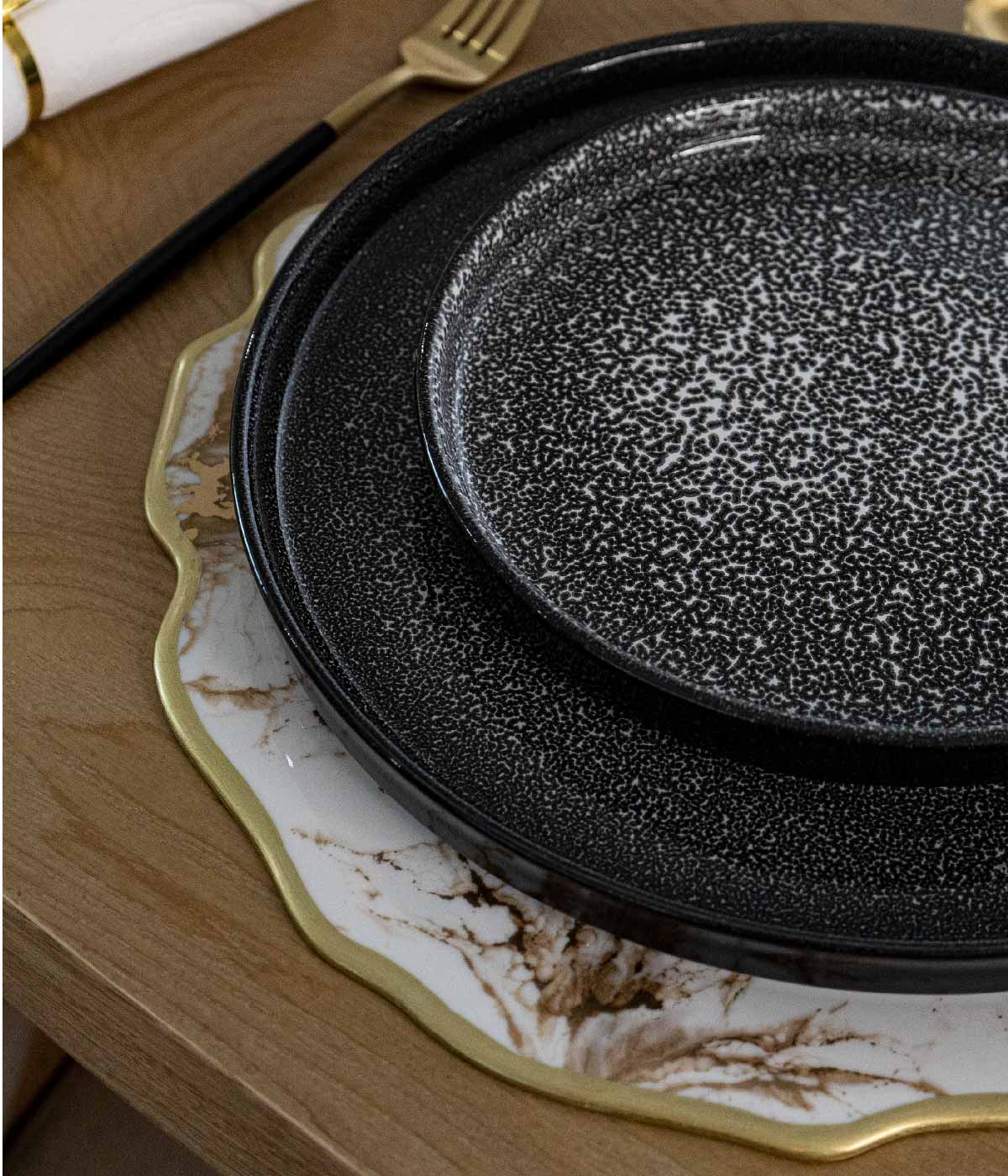 Vajilla en color negro, moderna y sofisticada, diseñada para destacar en cualquier mesa. Su acabado elegante y resistente la convierte en la elección perfecta para quienes buscan un toque de distinción en sus comidas.