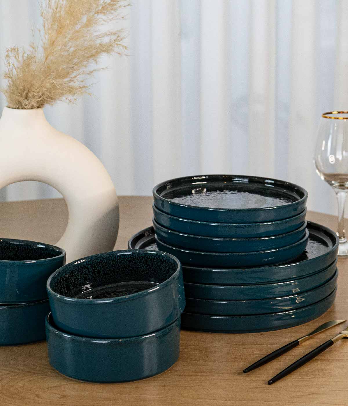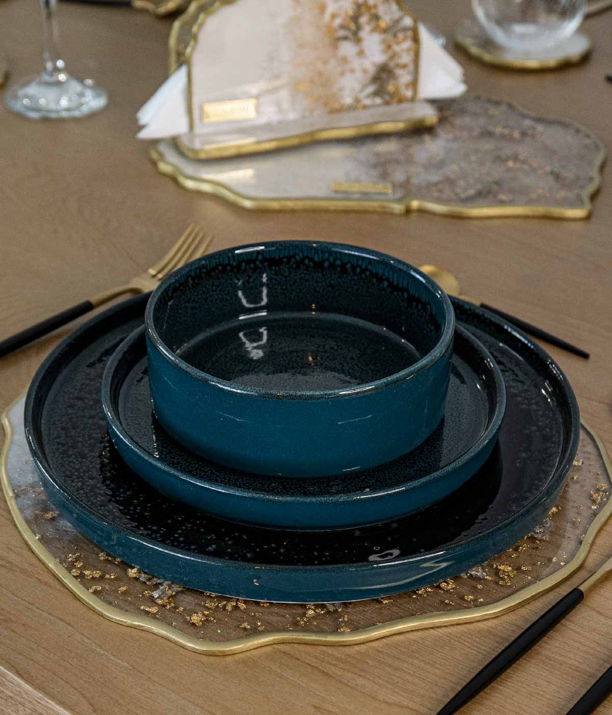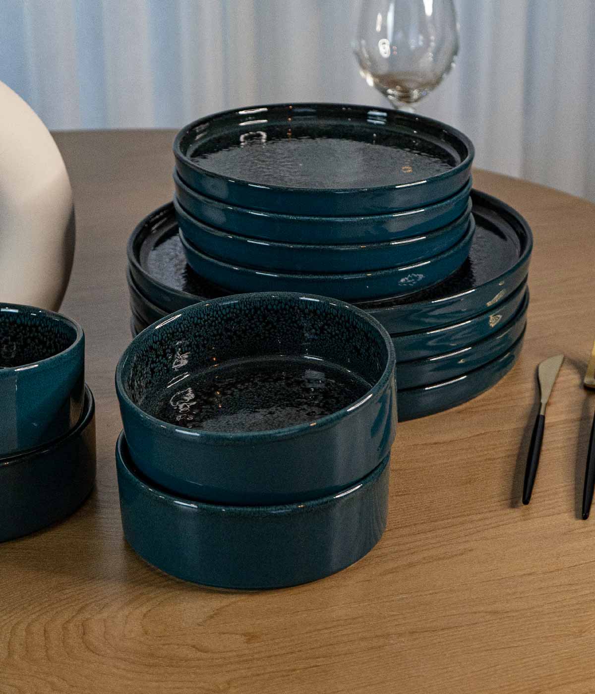 Vajilla que combina elegancia y serenidad en cada pieza. Su tono profundo y sofisticado añade un toque de distinción, ideal para realzar tus reuniones y ocasiones especiales.