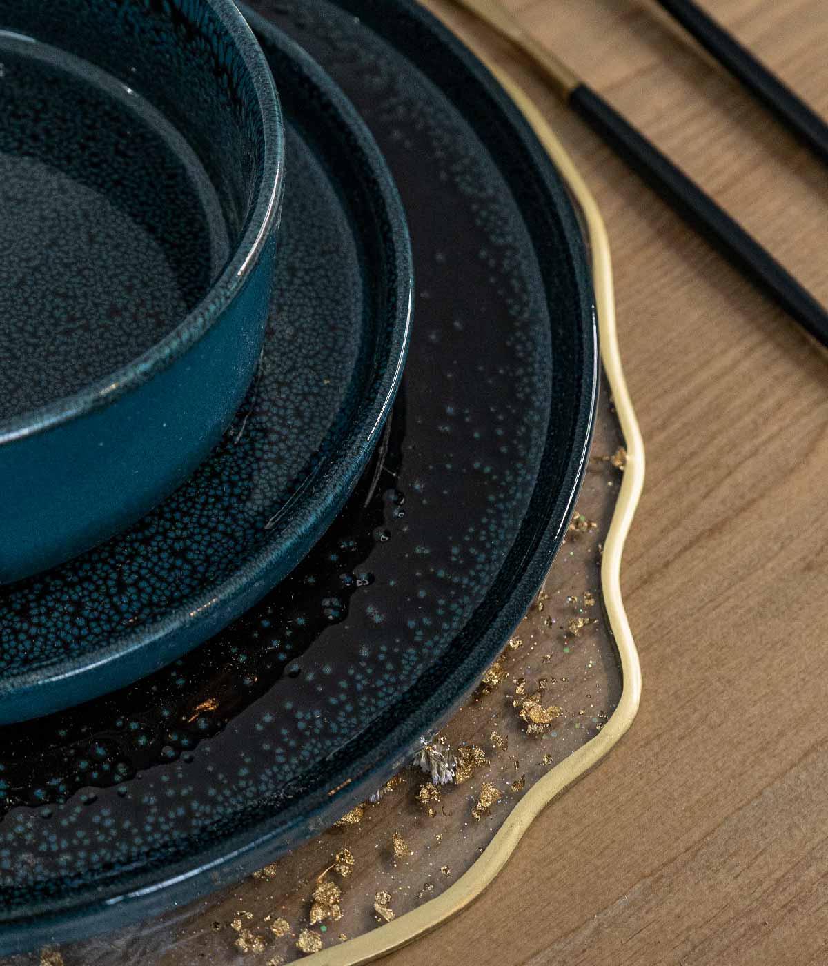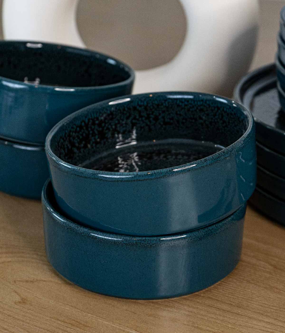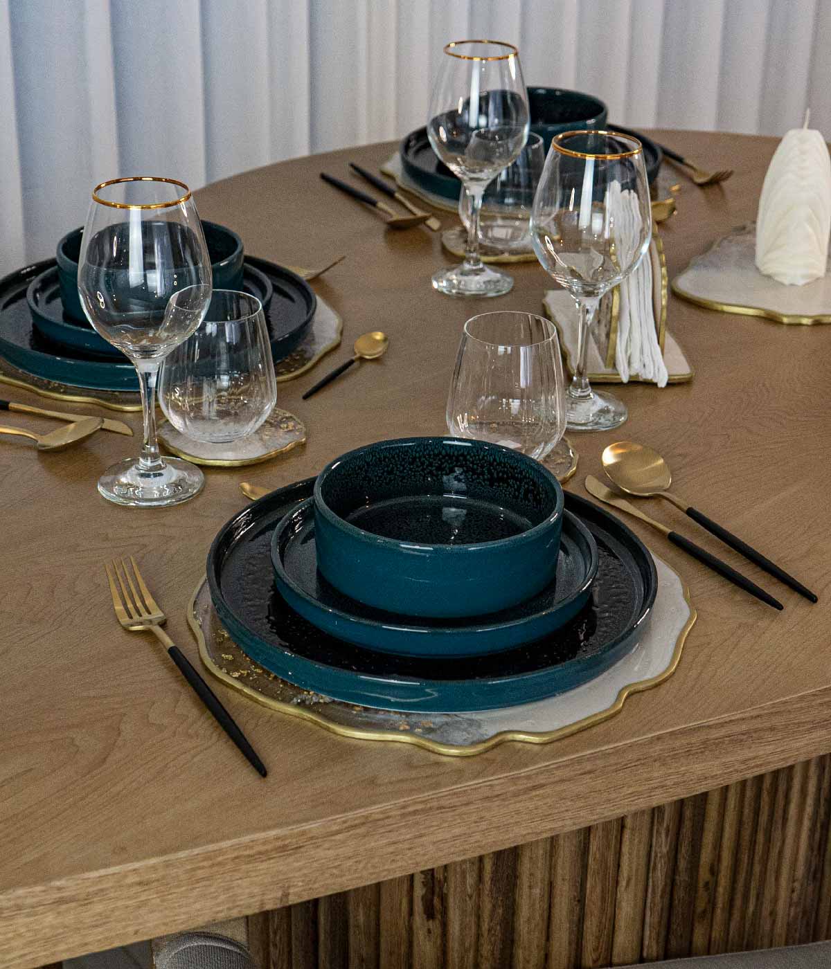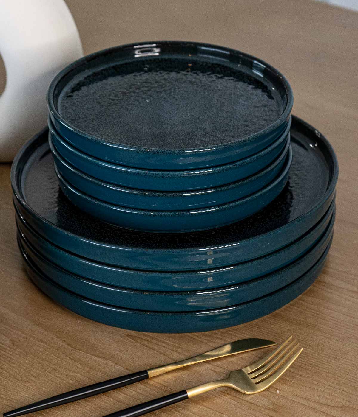 Vajilla que combina elegancia y serenidad en cada pieza. Su tono profundo y sofisticado añade un toque de distinción, ideal para realzar tus reuniones y ocasiones especiales.