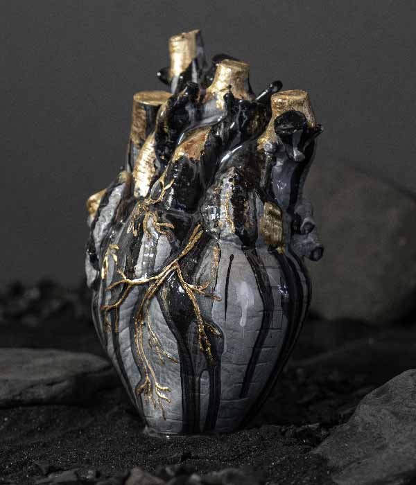 Cada pieza nace de la cueva de la fábrica en Villa de Leyva, un espacio que se volvió templo creativo y punto de partida de esta colección. Allí se dio forma a 21 corazones numerados, concebidos como reliquias contemporáneas.