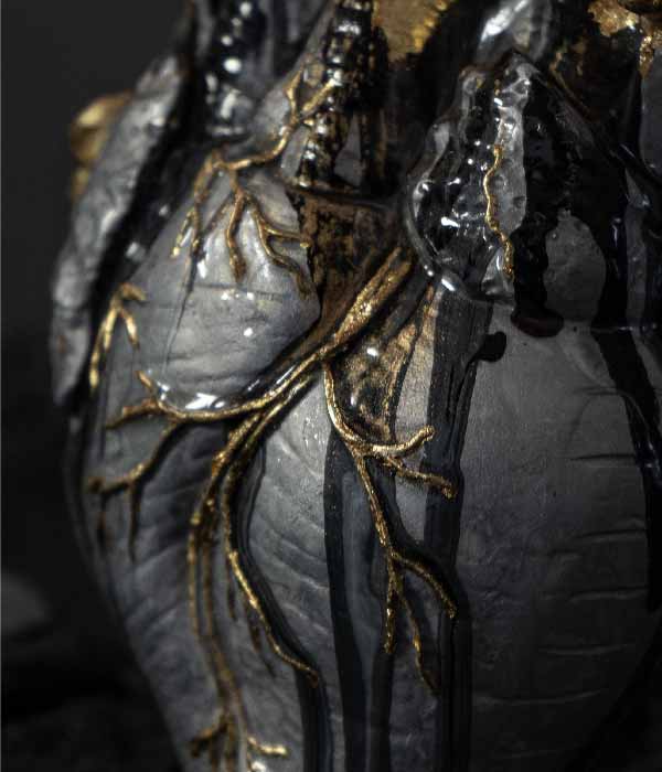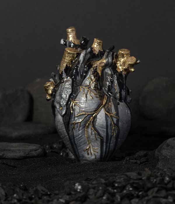 Cada pieza nace de la cueva de la fábrica en Villa de Leyva, un espacio que se volvió templo creativo y punto de partida de esta colección. Allí se dio forma a 21 corazones numerados, concebidos como reliquias contemporáneas.