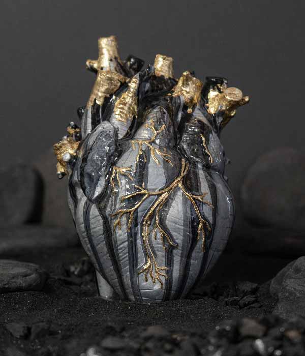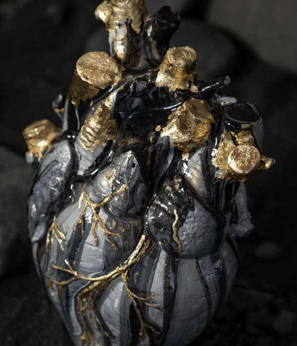 Cada pieza nace de la cueva de la fábrica en Villa de Leyva, un espacio que se volvió templo creativo y punto de partida de esta colección. Allí se dio forma a 21 corazones numerados, concebidos como reliquias contemporáneas.