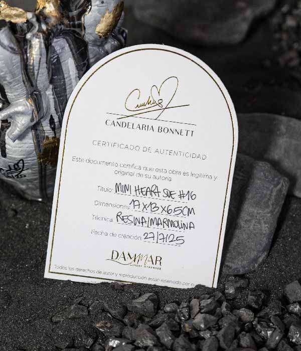 Cada corazón llega en una caja de lujo y acompañado de un par de memorias y un manifiesto: un registro íntimo del instante en el que estas piezas fueron creadas, de lo que se sintió, y de la energía que quedó sellada en cada una.