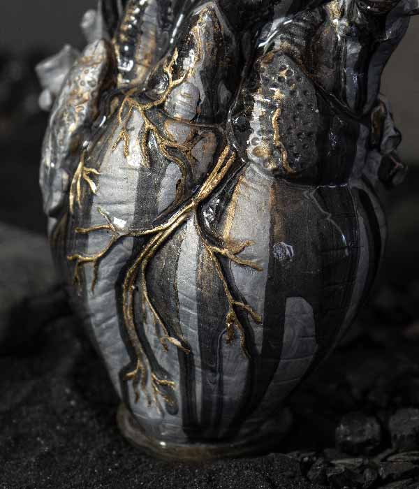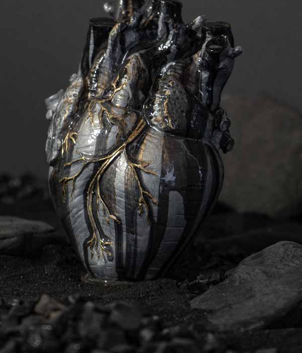 Cada pieza nace de la cueva de la fábrica en Villa de Leyva, un espacio que se volvió templo creativo y punto de partida de esta colección. Allí se dio forma a 21 corazones numerados, concebidos como reliquias contemporáneas.