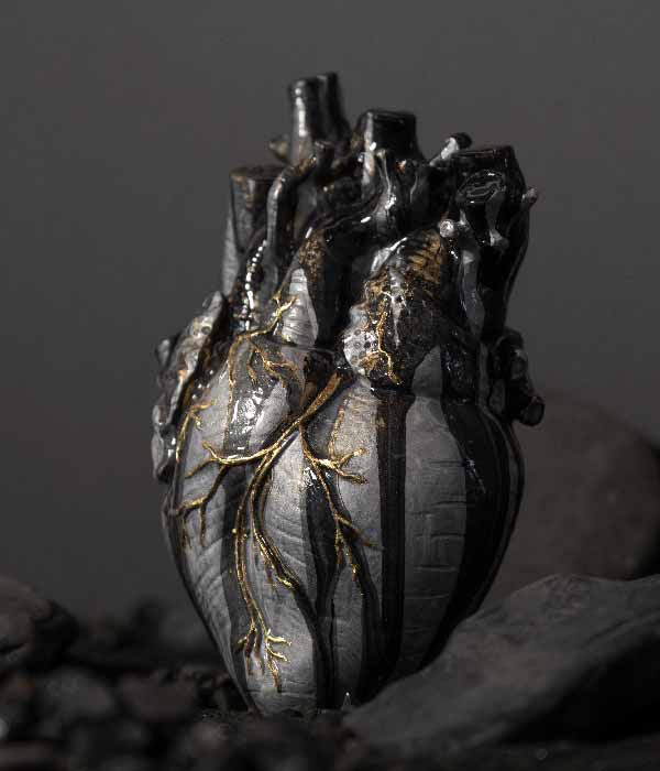 Cada pieza nace de la cueva de la fábrica en Villa de Leyva, un espacio que se volvió templo creativo y punto de partida de esta colección. Allí se dio forma a 21 corazones numerados, concebidos como reliquias contemporáneas.