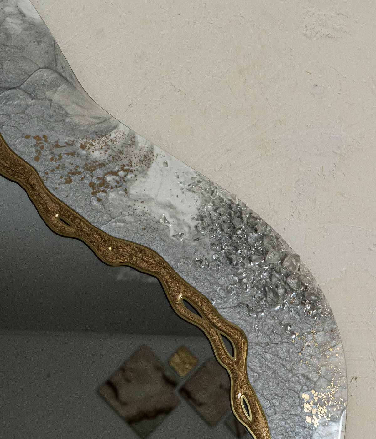 Hermoso espejo irregular de pared perfecto para complementar tus espacios en colores blanco, nácar, gris y lineas en relieve.