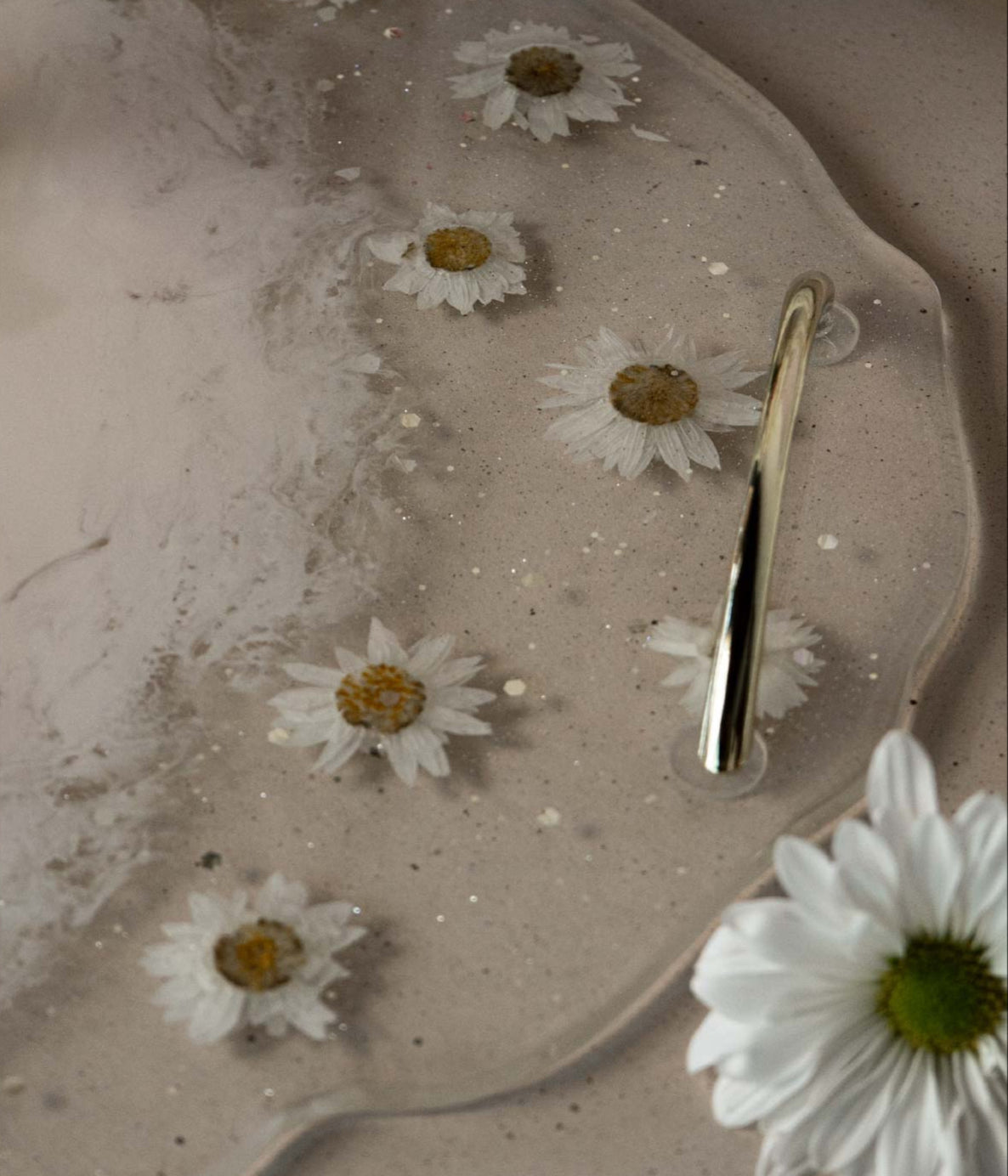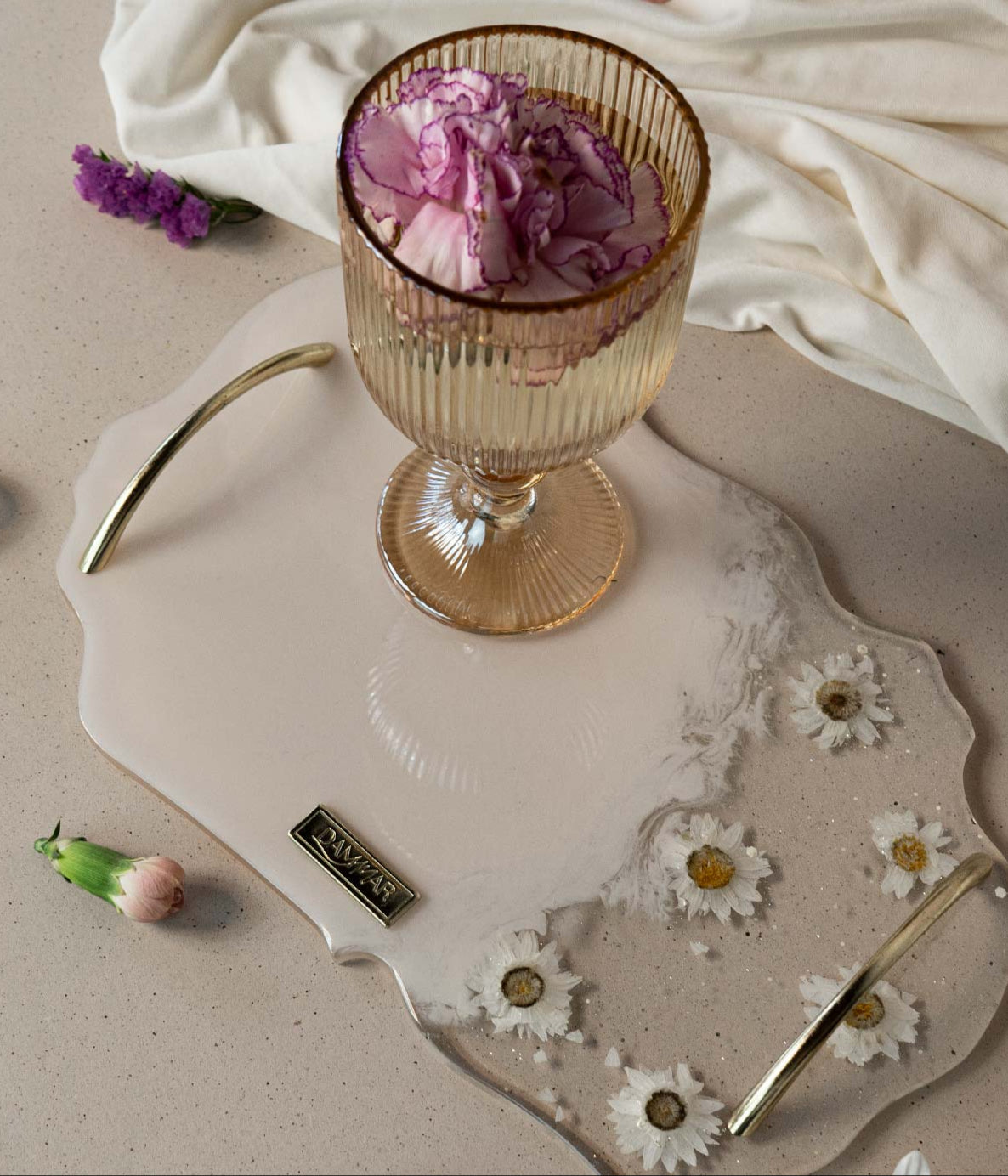 Esta bandeja es ideal para quienes buscan lujo y sofisticación. Diseñada con margaritas blancas naturales incrustadas, un tono rosa pálido como base y transparencia con delicados destellos que logran el equilibrio perfecto para resaltar sobre cualquier superficie. Detalles que no pasan desapercibidos y realzan su elegancia.