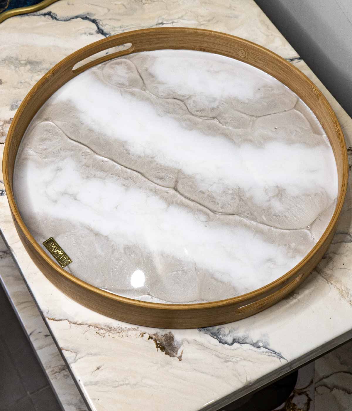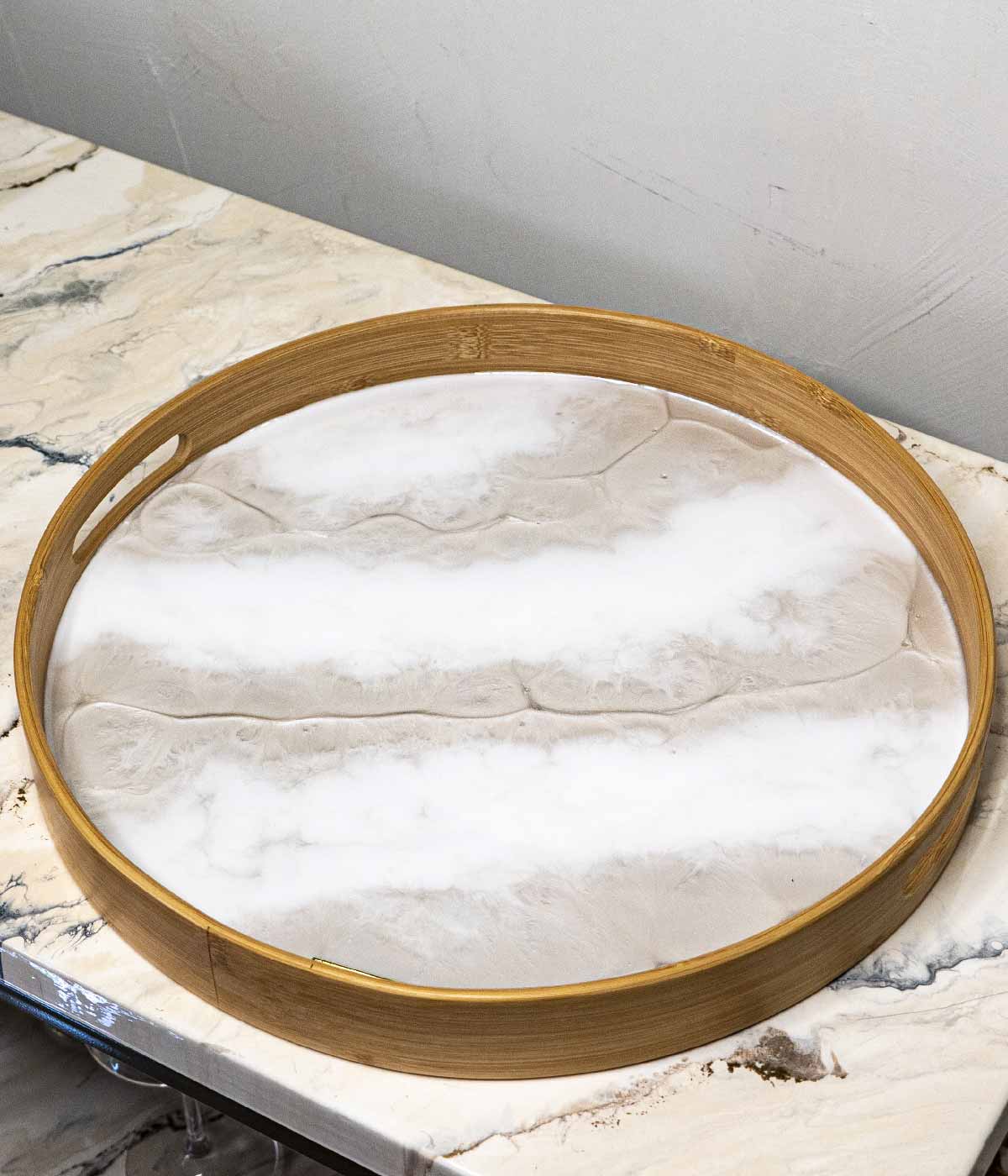 Bandeja para servir con un excelente espacio y borde en madera para evitar accidentes o derrames. Medidas: 40 cm Material: Resina y bambú Hecho a mano