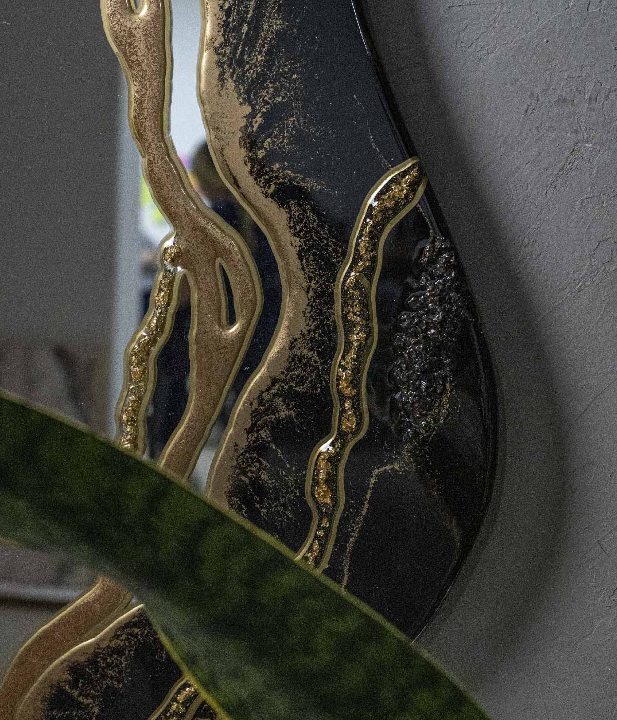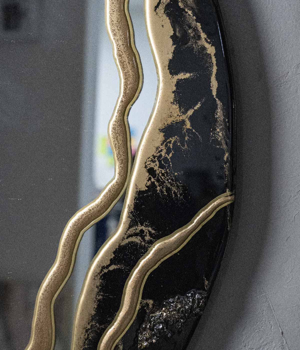 Hermoso espejo irregular de pared perfecto para complementar tus espacios en colores blanco, nácar, dorado y lineas en relieve.