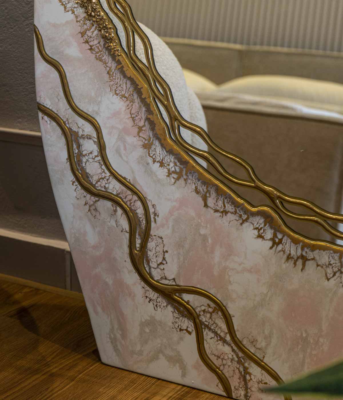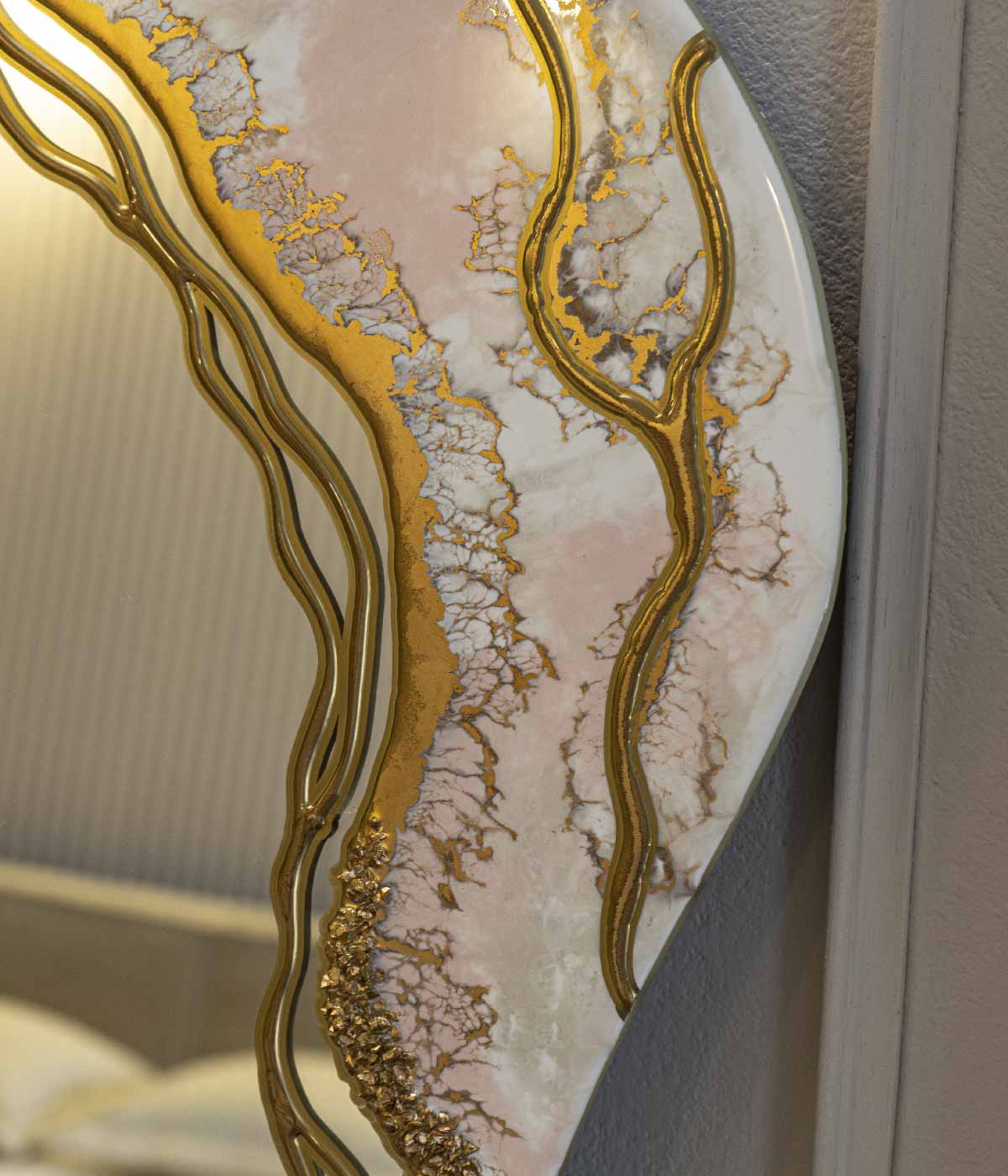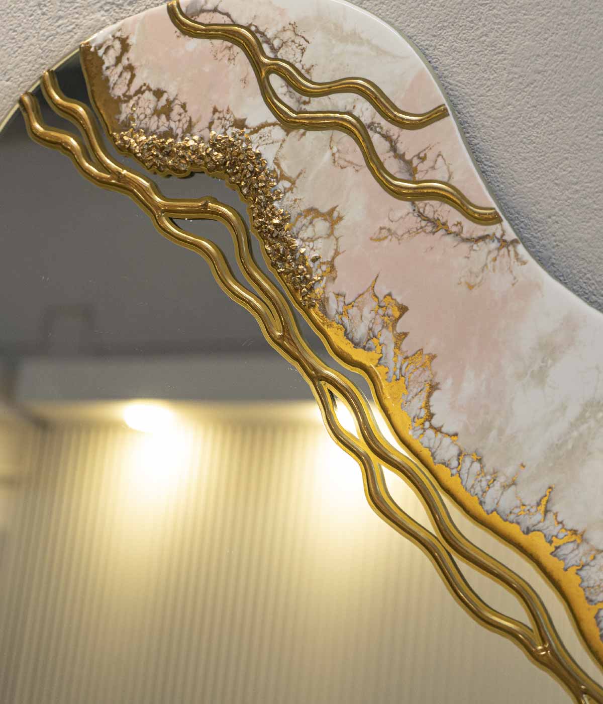 Hermoso espejo irregular de pared perfecto para complementar tus espacios en colores blanco, rosa, dorado y lineas en relieve.