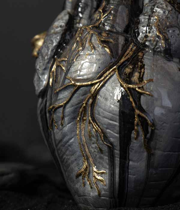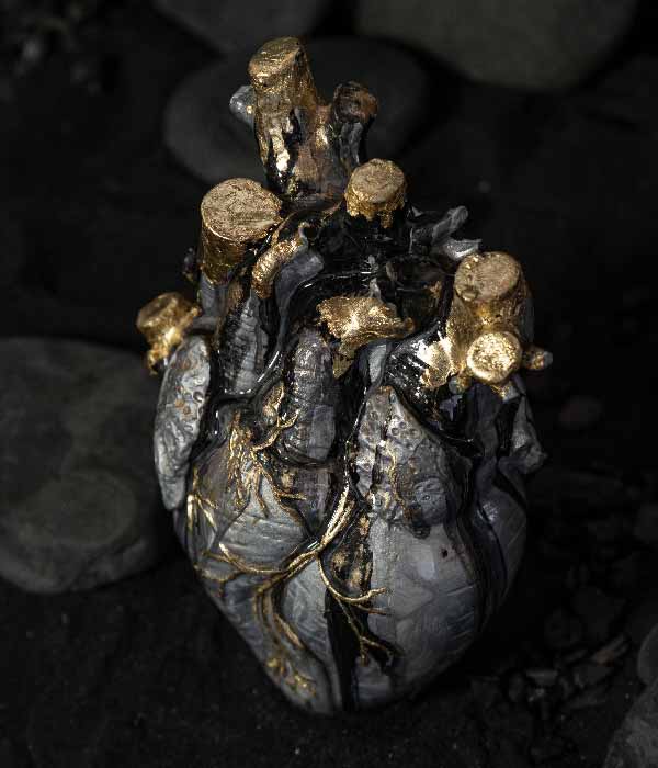 Cada pieza nace de la cueva de la fábrica en Villa de Leyva, un espacio que se volvió templo creativo y punto de partida de esta colección. Allí se dio forma a 21 corazones numerados, concebidos como reliquias contemporáneas.