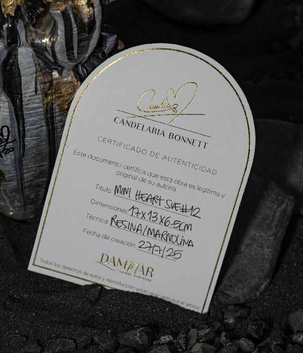 Cada corazón llega en una caja de lujo y acompañado de un par de memorias y un manifiesto: un registro íntimo del instante en el que estas piezas fueron creadas, de lo que se sintió, y de la energía que quedó sellada en cada una.
