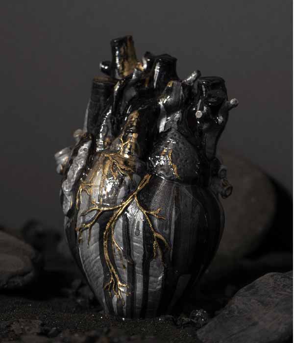 Cada pieza nace de la cueva de la fábrica en Villa de Leyva, un espacio que se volvió templo creativo y punto de partida de esta colección. Allí se dio forma a 21 corazones numerados, concebidos como reliquias contemporáneas.