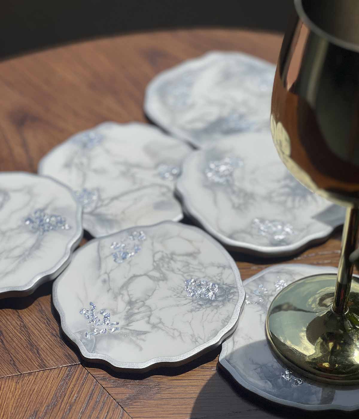 ✨ Elegancia y resistencia en tu mesa ✨ Hermosos portavasos marmolados con toques de laminilla perfectos para proteger tus mesas y decorar tus ambientes Medidas: 10 cm Material: 100% Resina y laminilla  Borde: Pintura oro 24K y plateado Personalízalo en los colores que tu elijas Hecho a mano