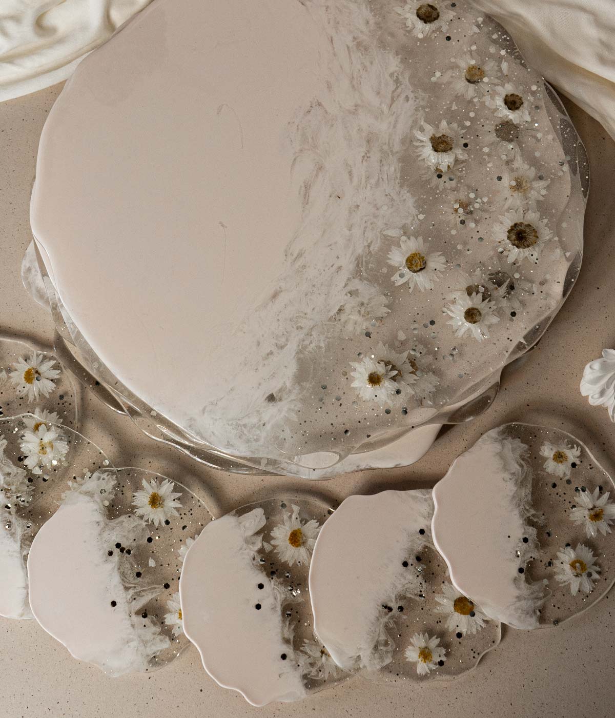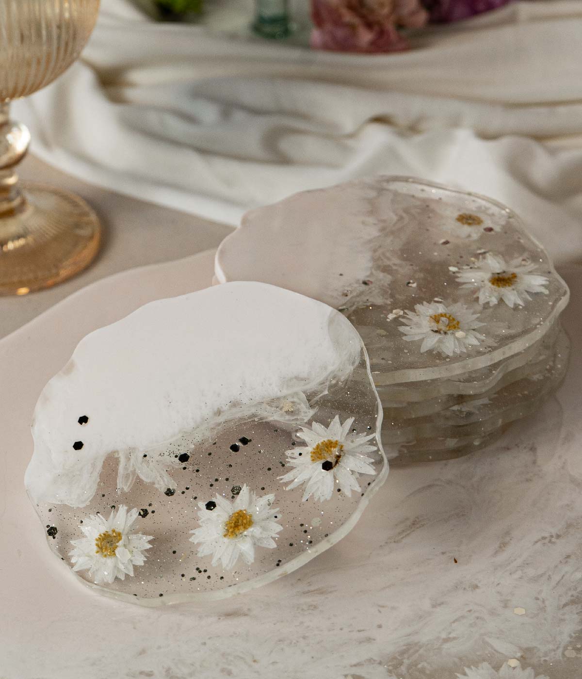 Protege tus superficies con estilo con nuestros elegantes portavasos. Diseñados con margaritas blancas naturales incrustadas, un tono rosa pálido como base y transparencia con delicados destellos que logran el equilibrio perfecto para resaltar sobre cualquier superficie. Detalles que no pasan desapercibidos y realzan su elegancia.