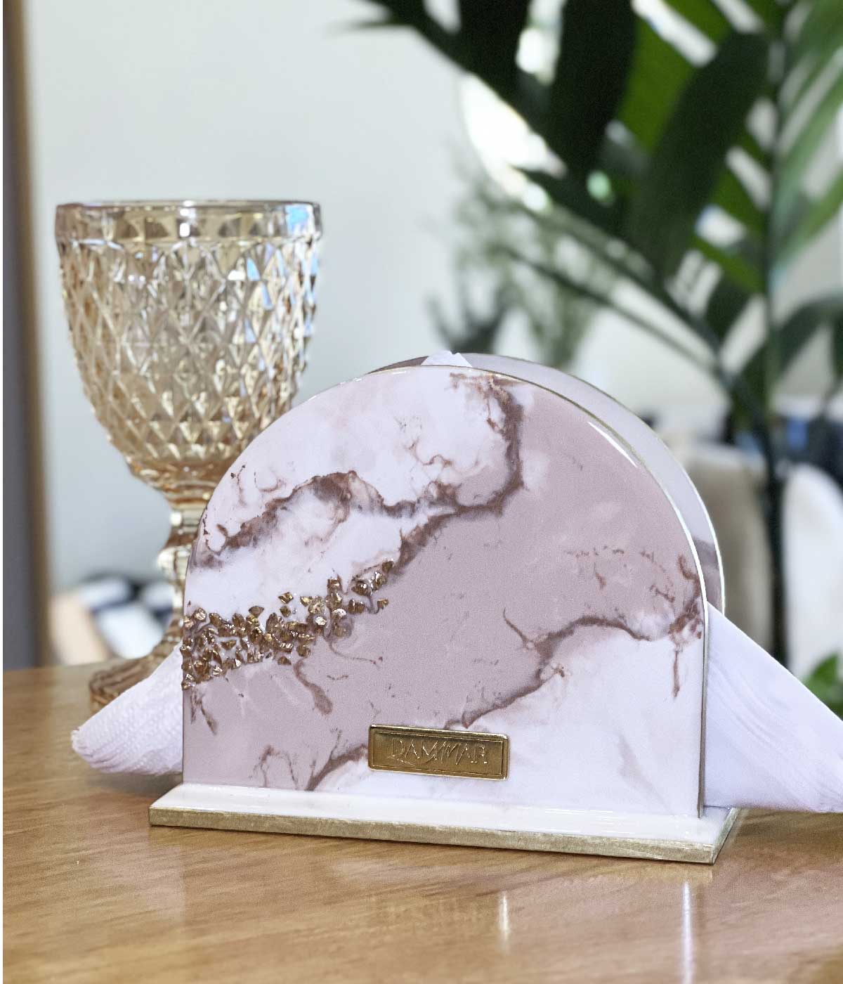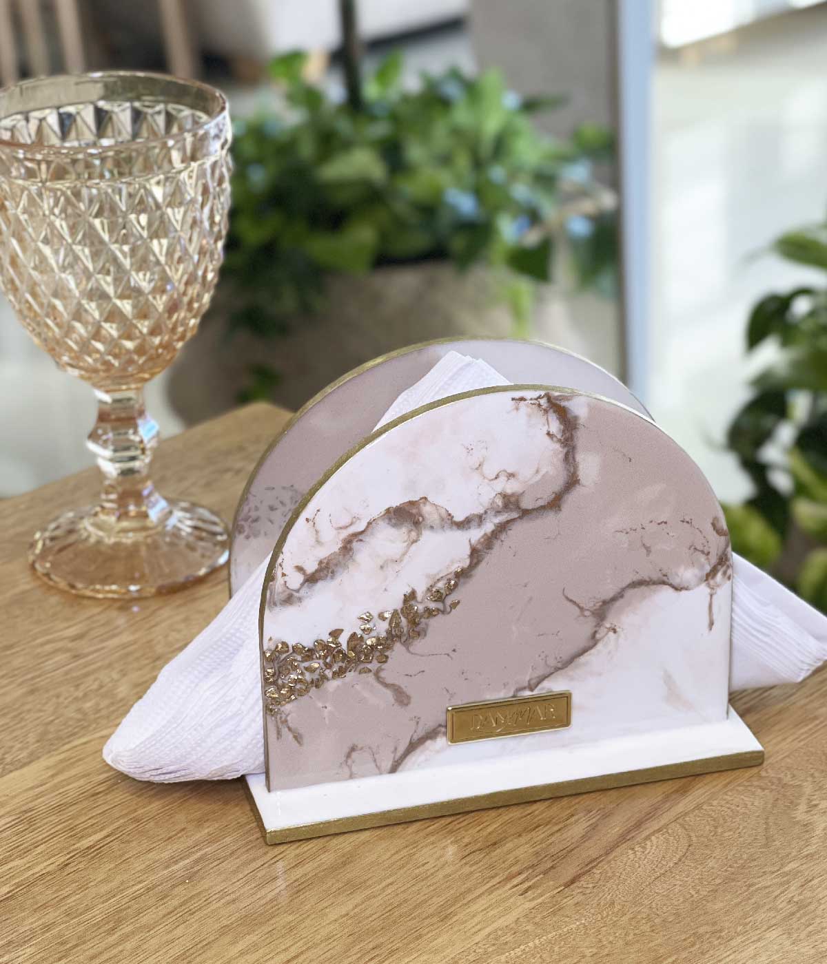 Hermoso servilletero con elegante diseño minimalista en forma ovalada y definida en color begie y blanco con piedras doradas.