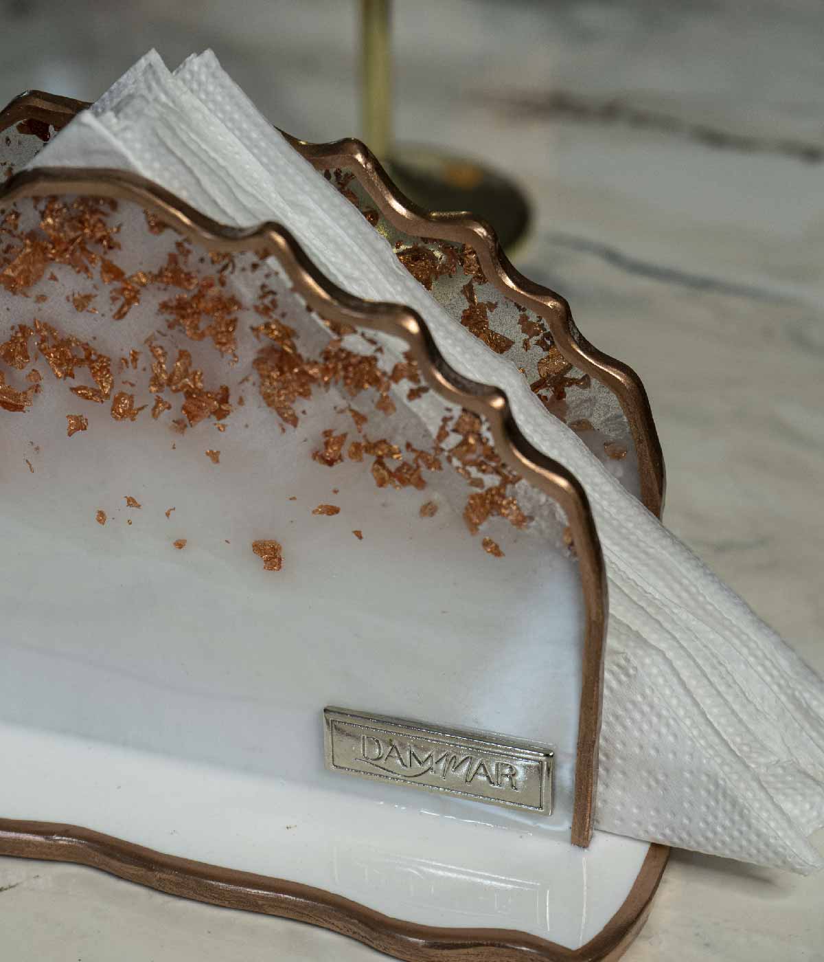 ✨ Elegancia y resistencia en tu mesa ✨ Hermoso servilletero irregular  en color blanco blanco con transparencia y laminilla oro rosa. Material: Resina Hecho a mano